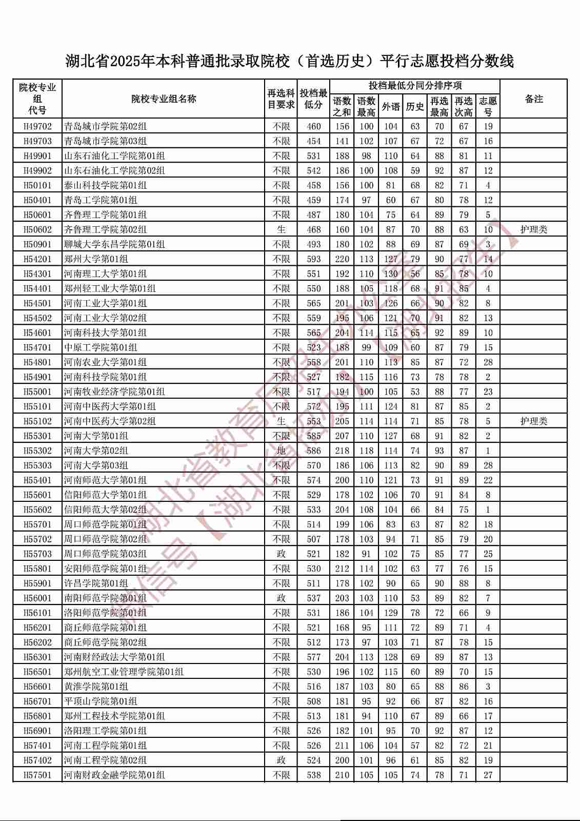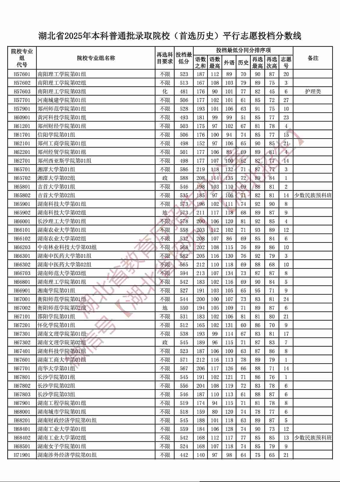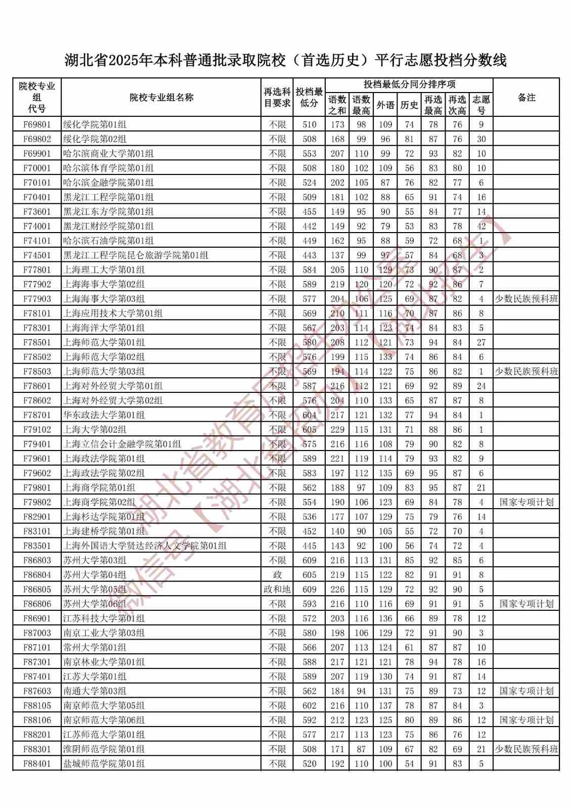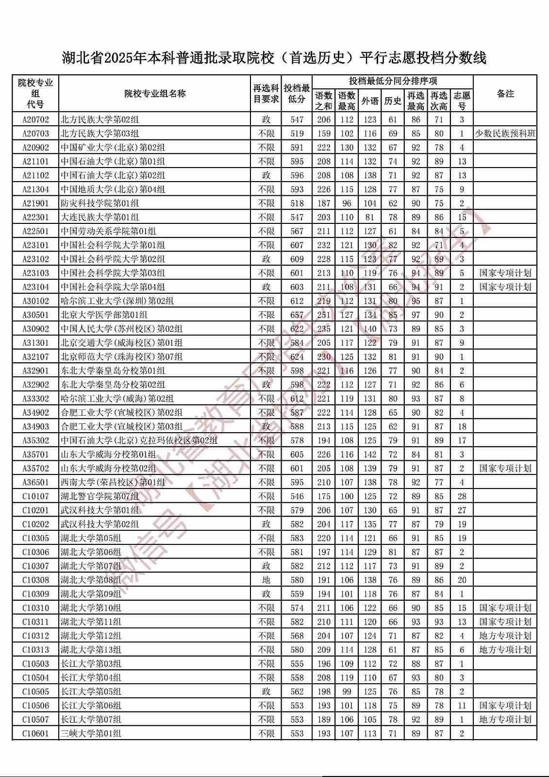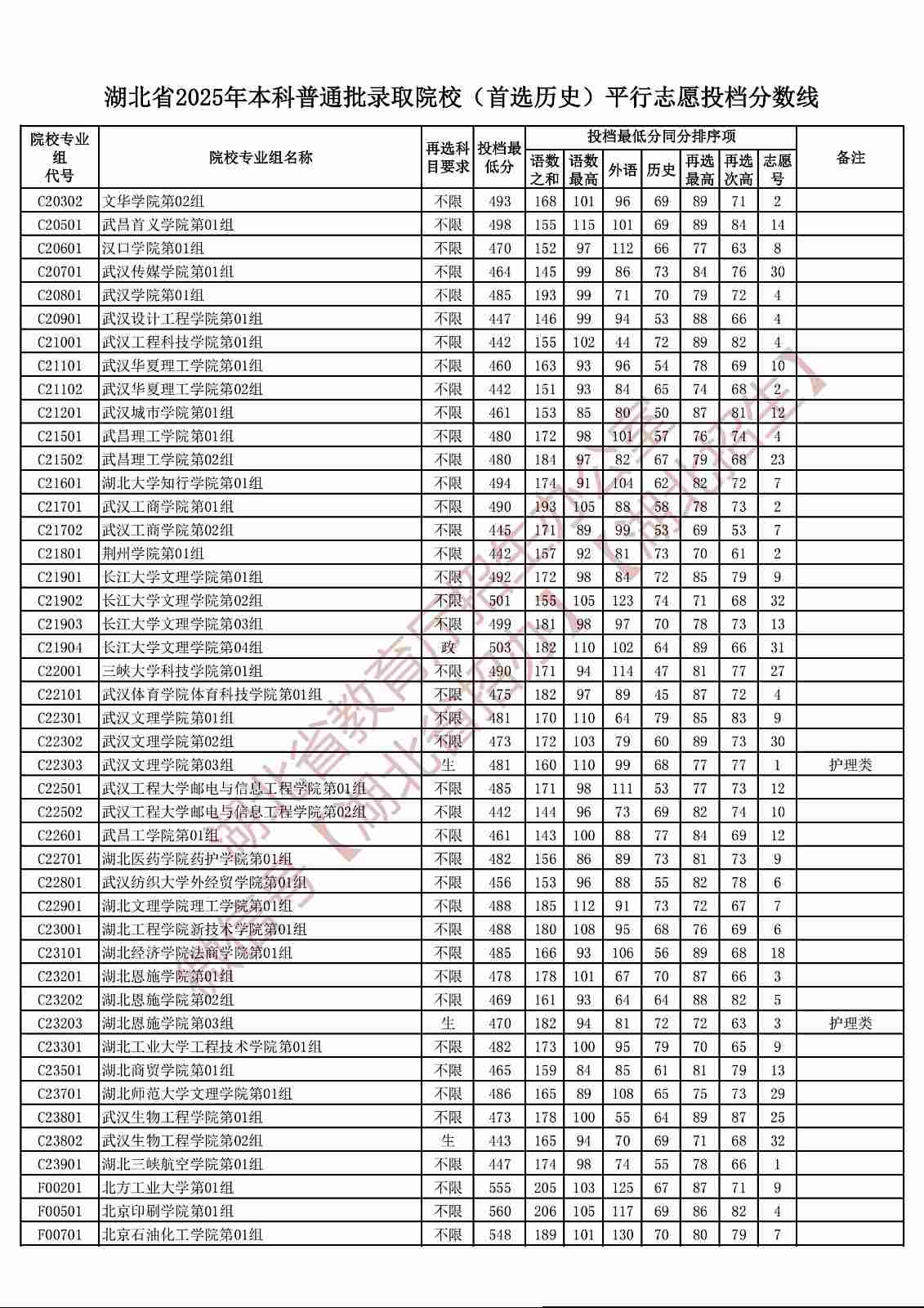 湖北省2025年本科普通批录取院校(首选历史)平行志愿投档分数线