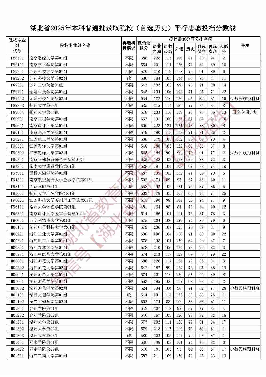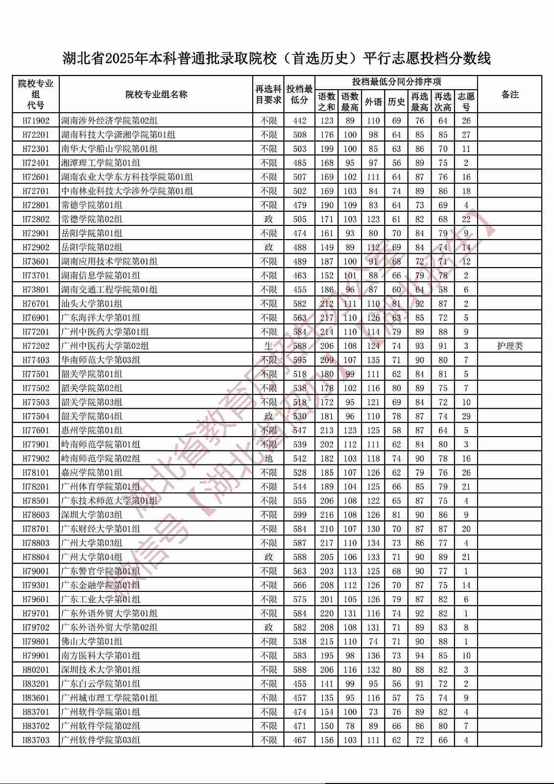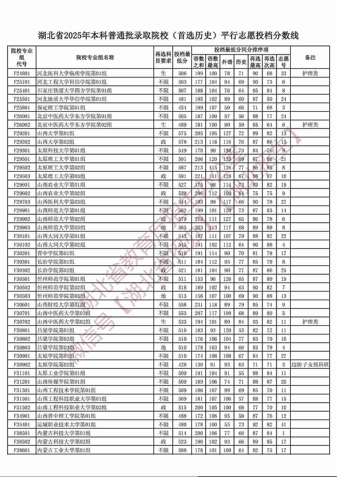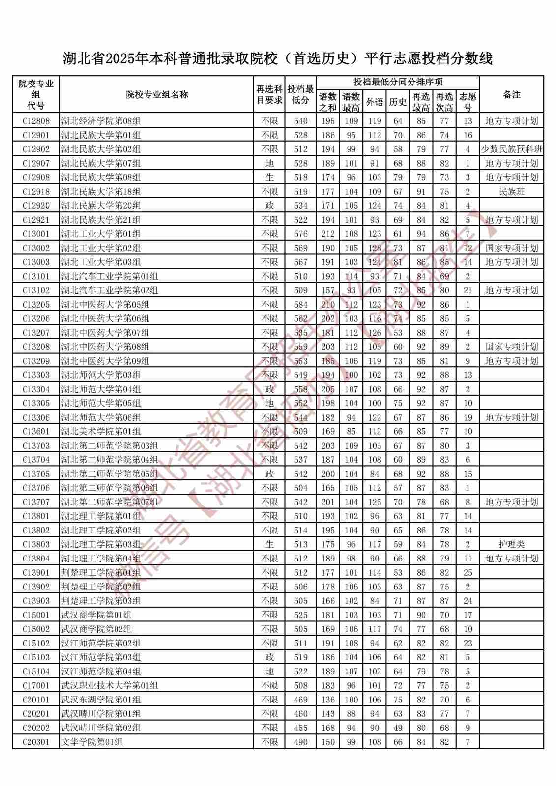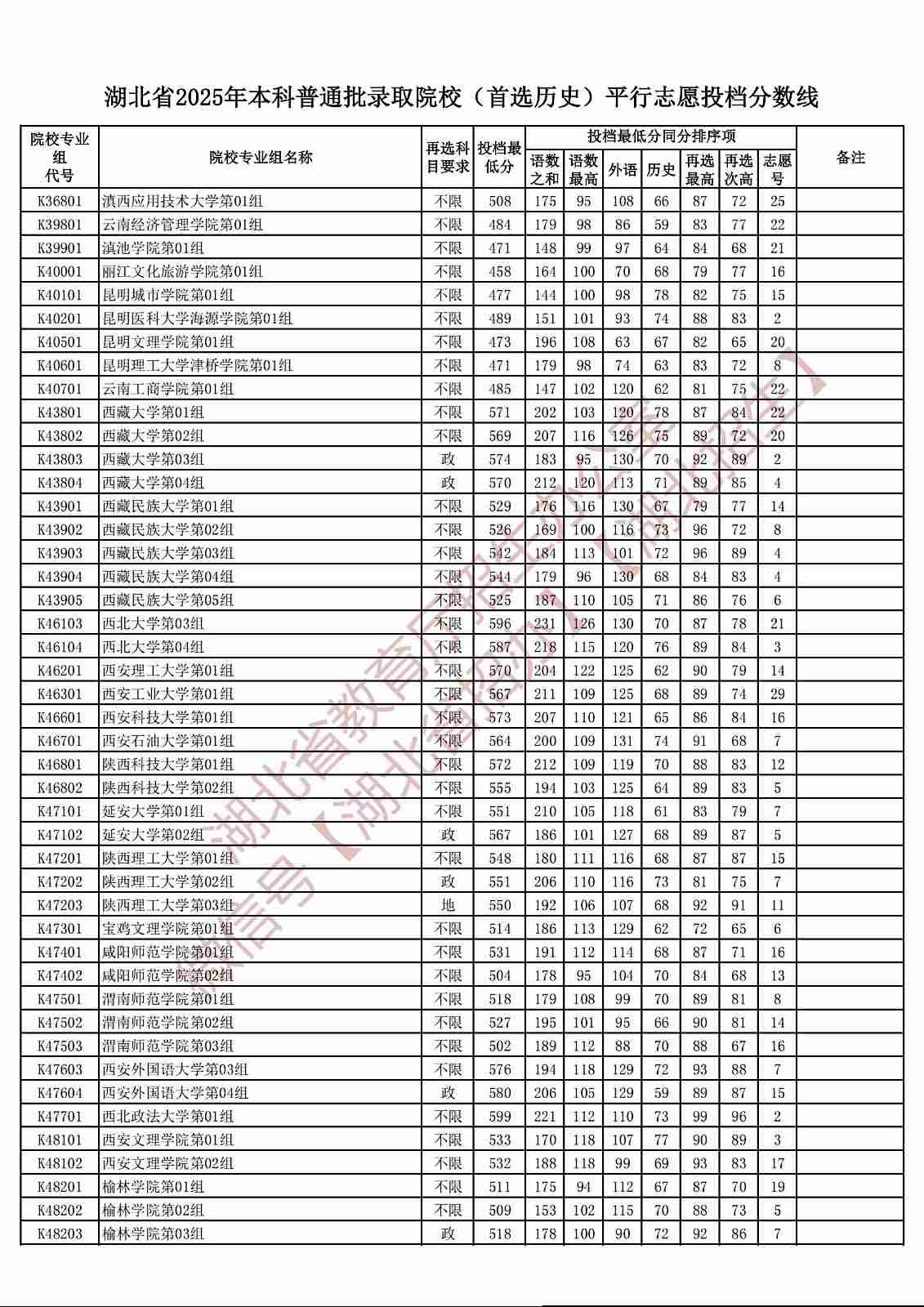 湖北省2025年本科普通批录取院校(首选历史)平行志愿投档分数线