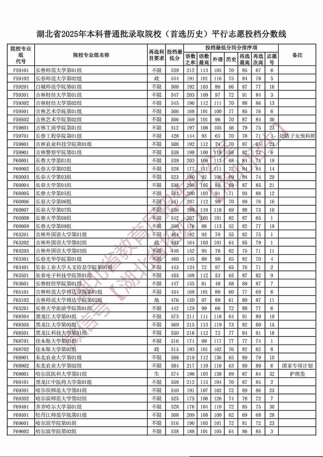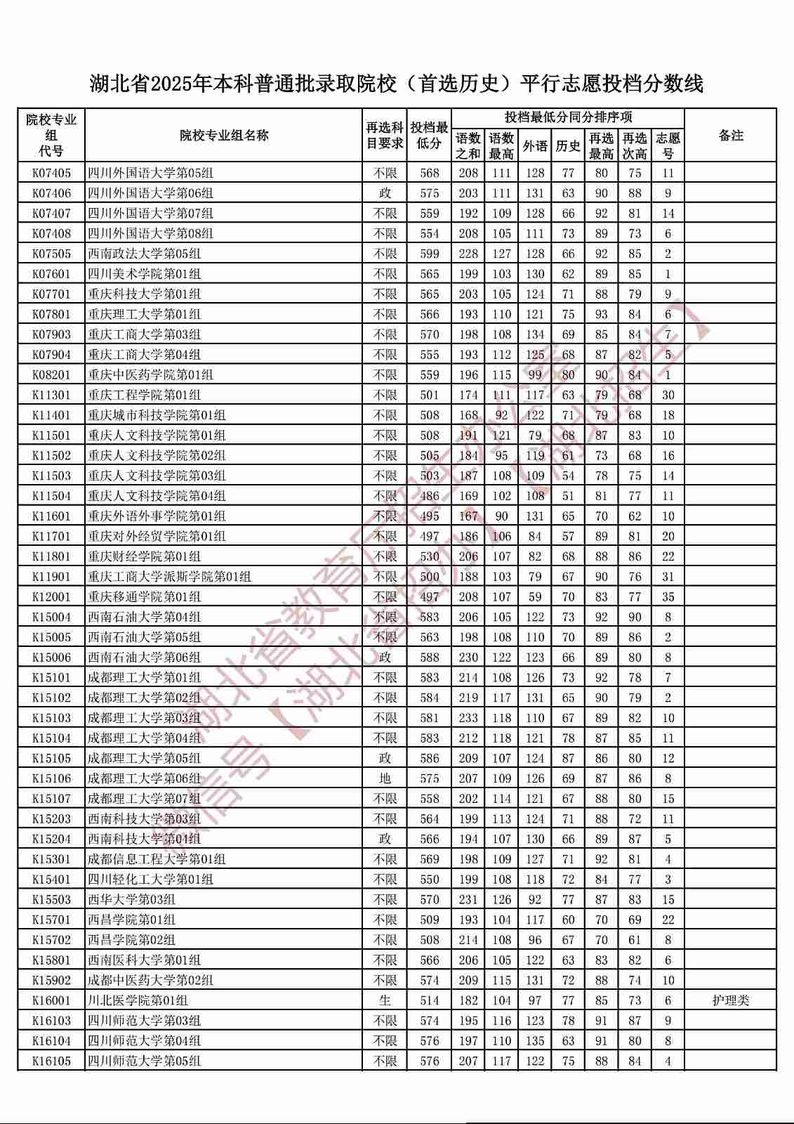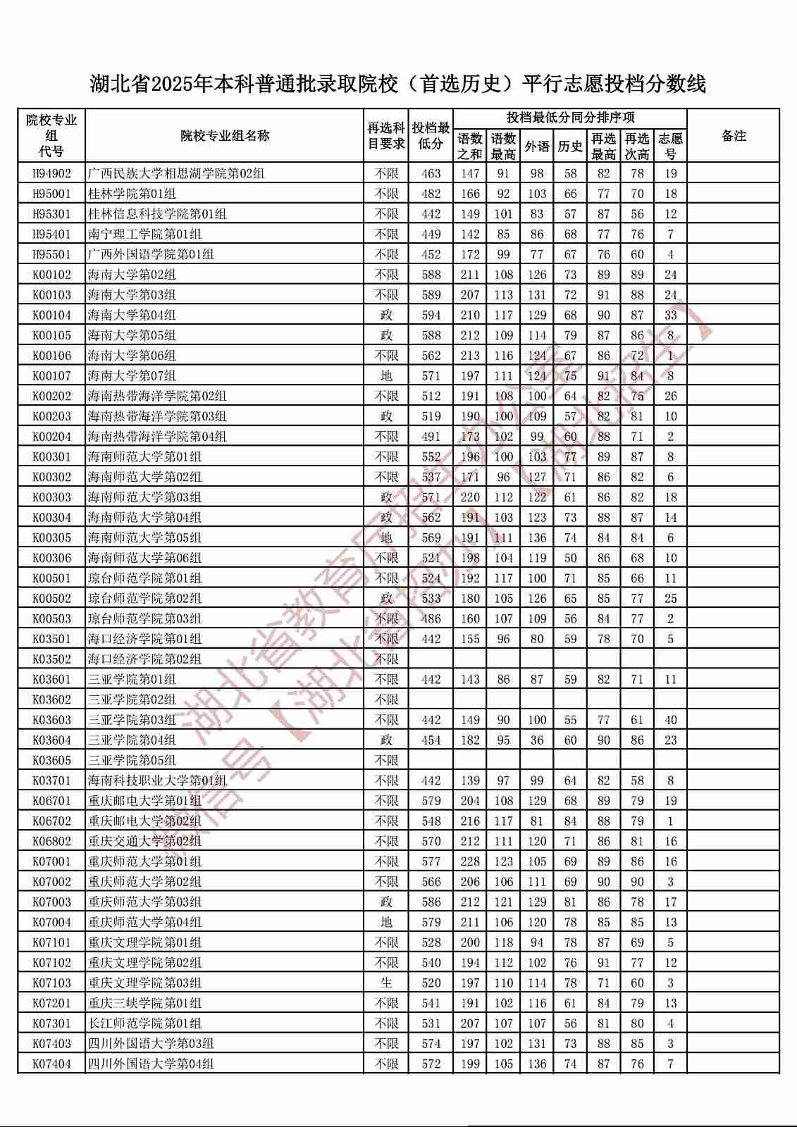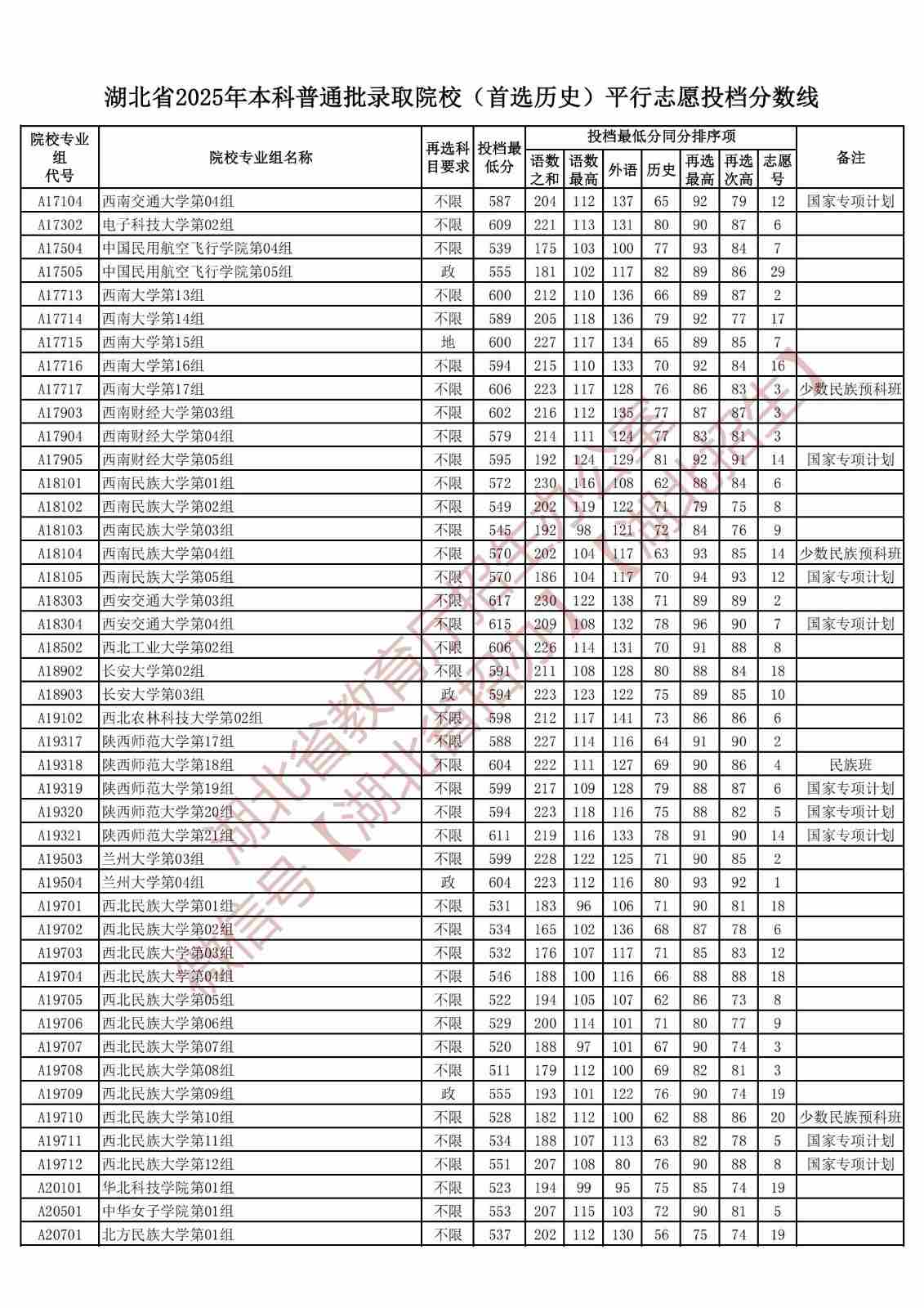 湖北省2025年本科普通批录取院校(首选历史)平行志愿投档分数线