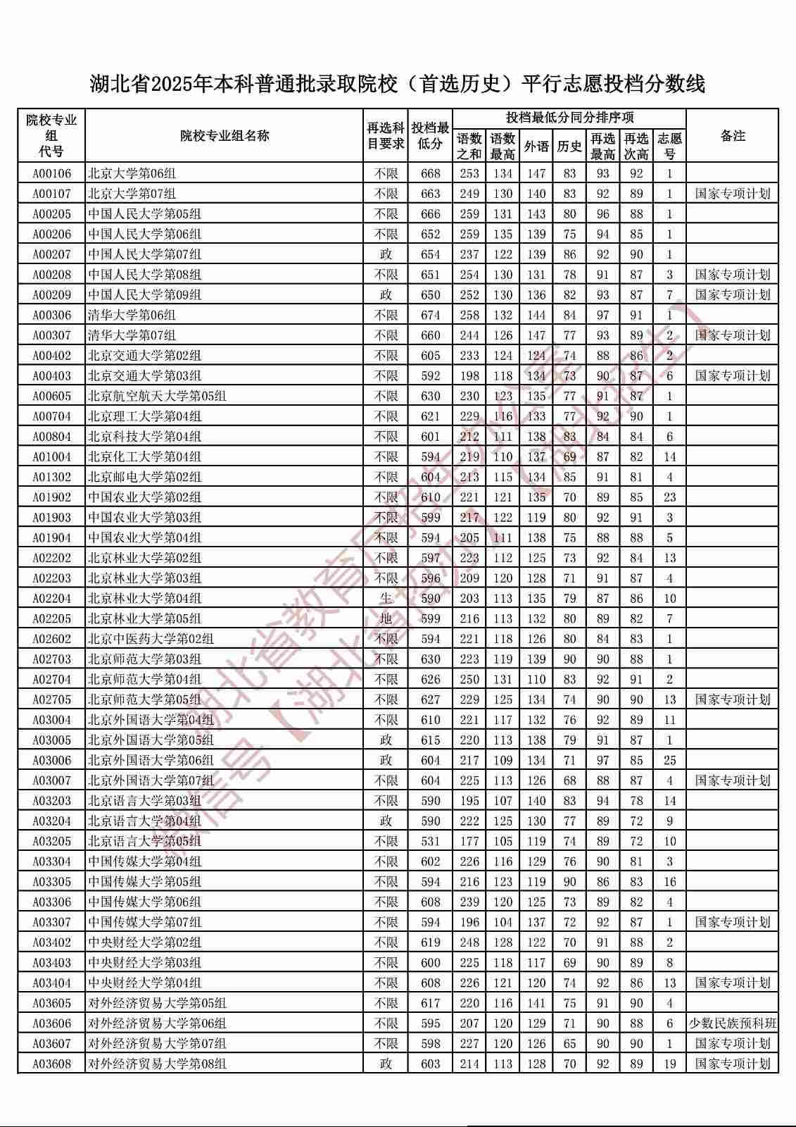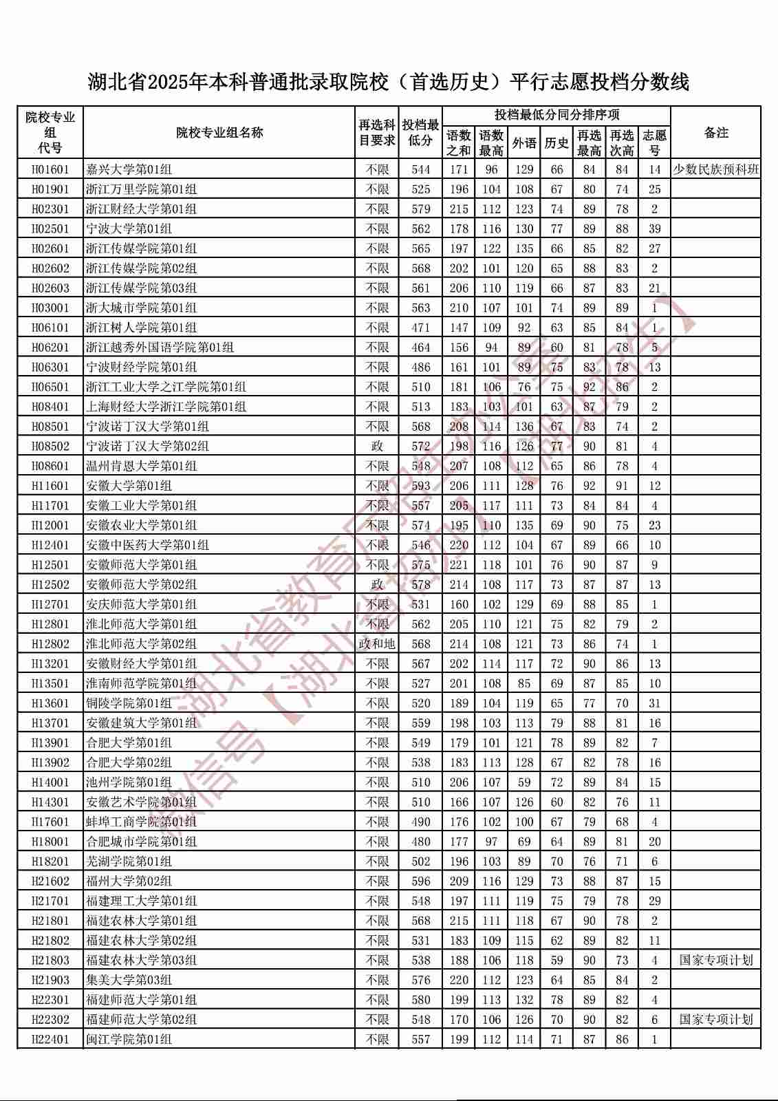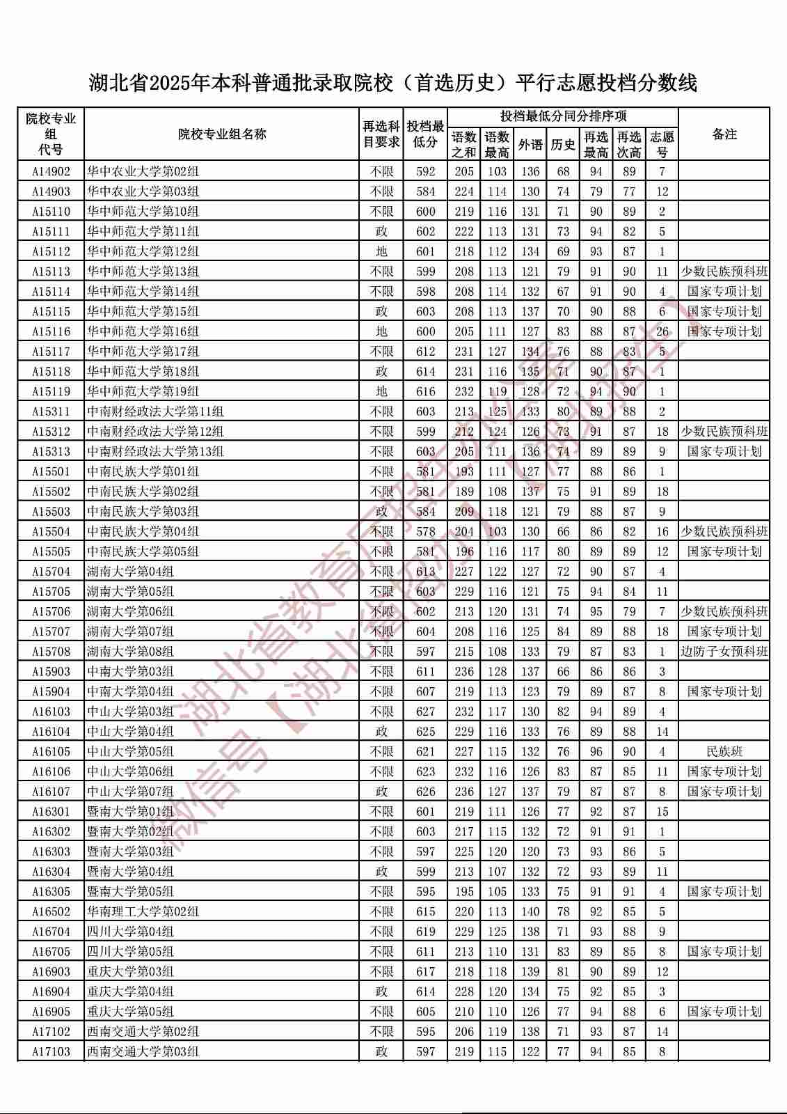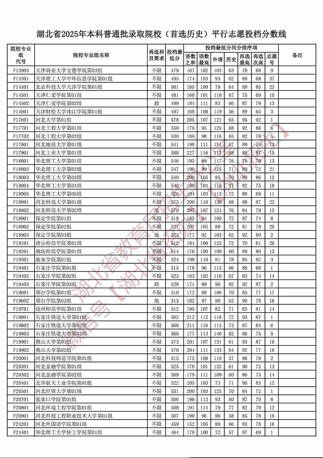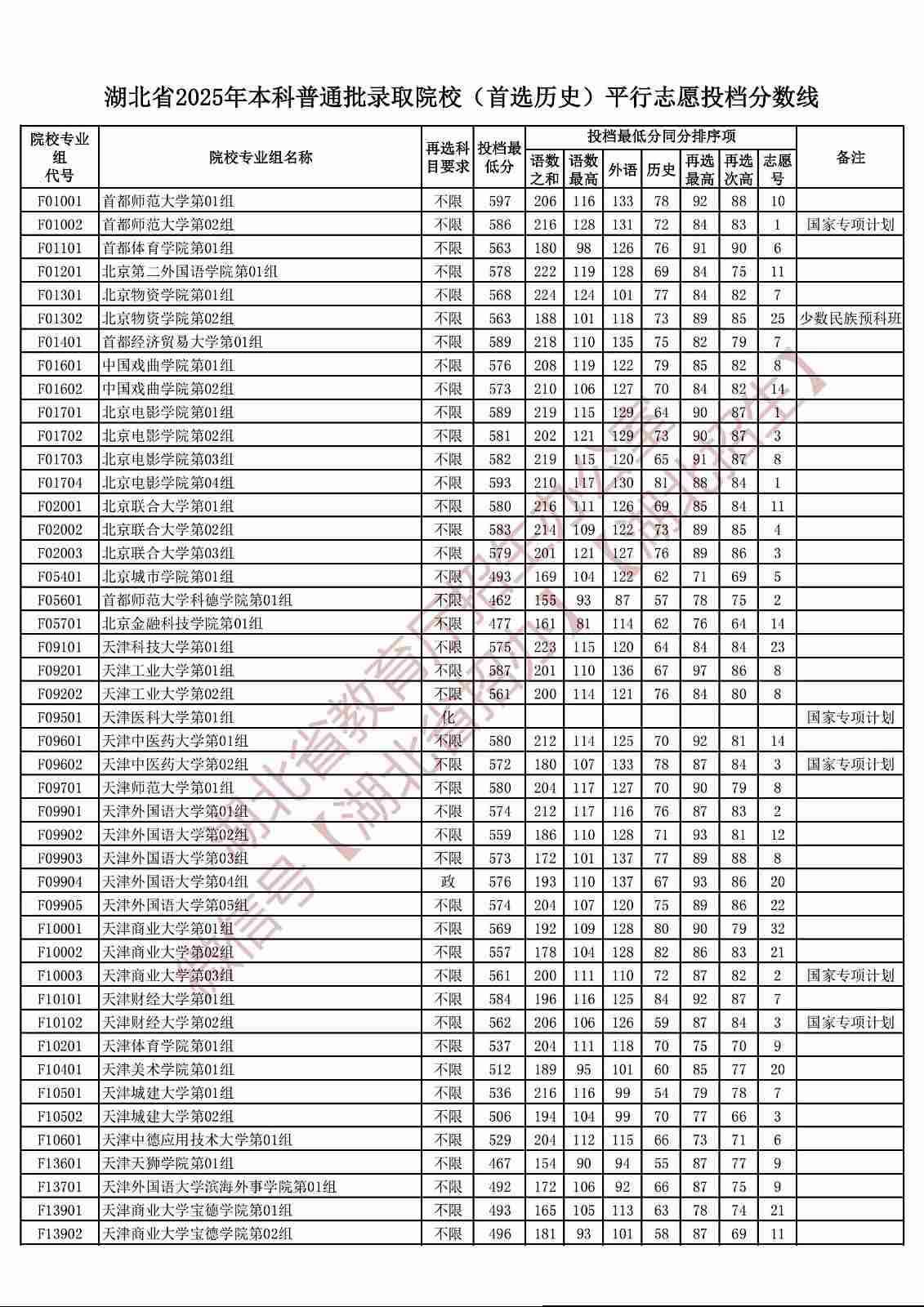 湖北省2025年本科普通批录取院校(首选历史)平行志愿投档分数线