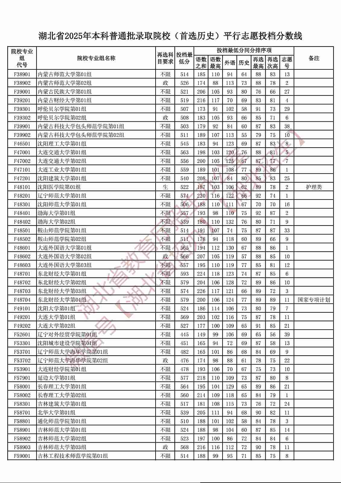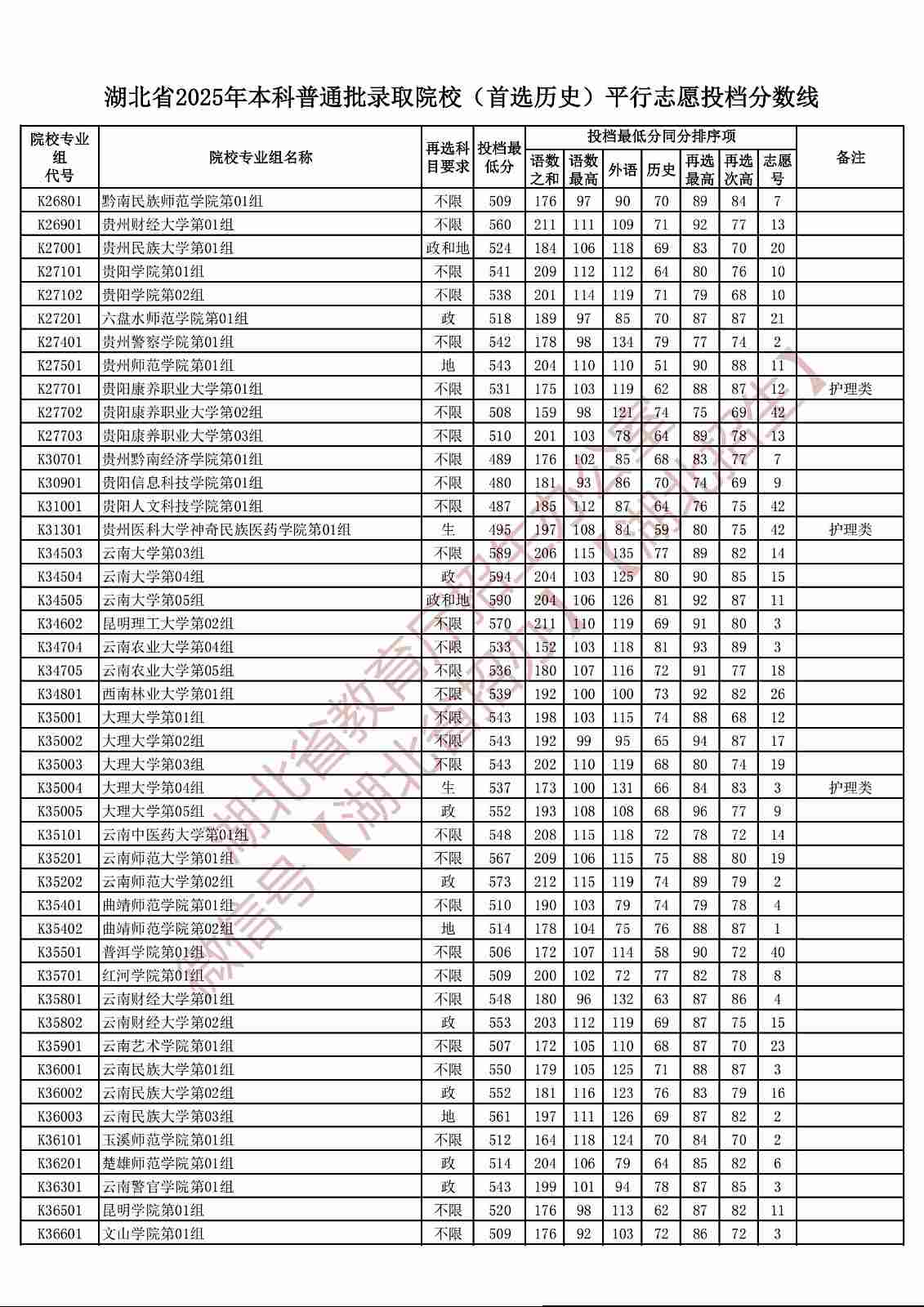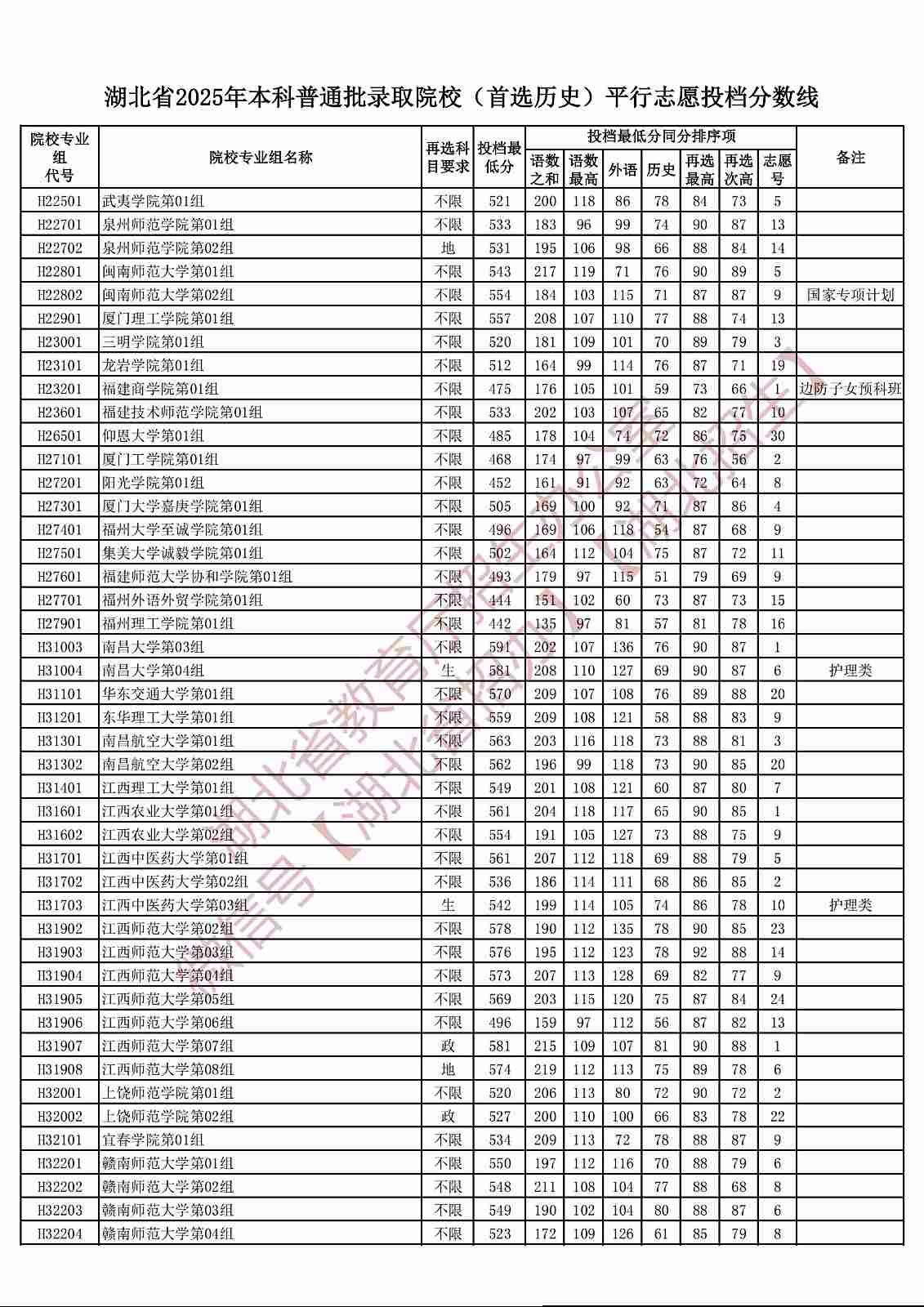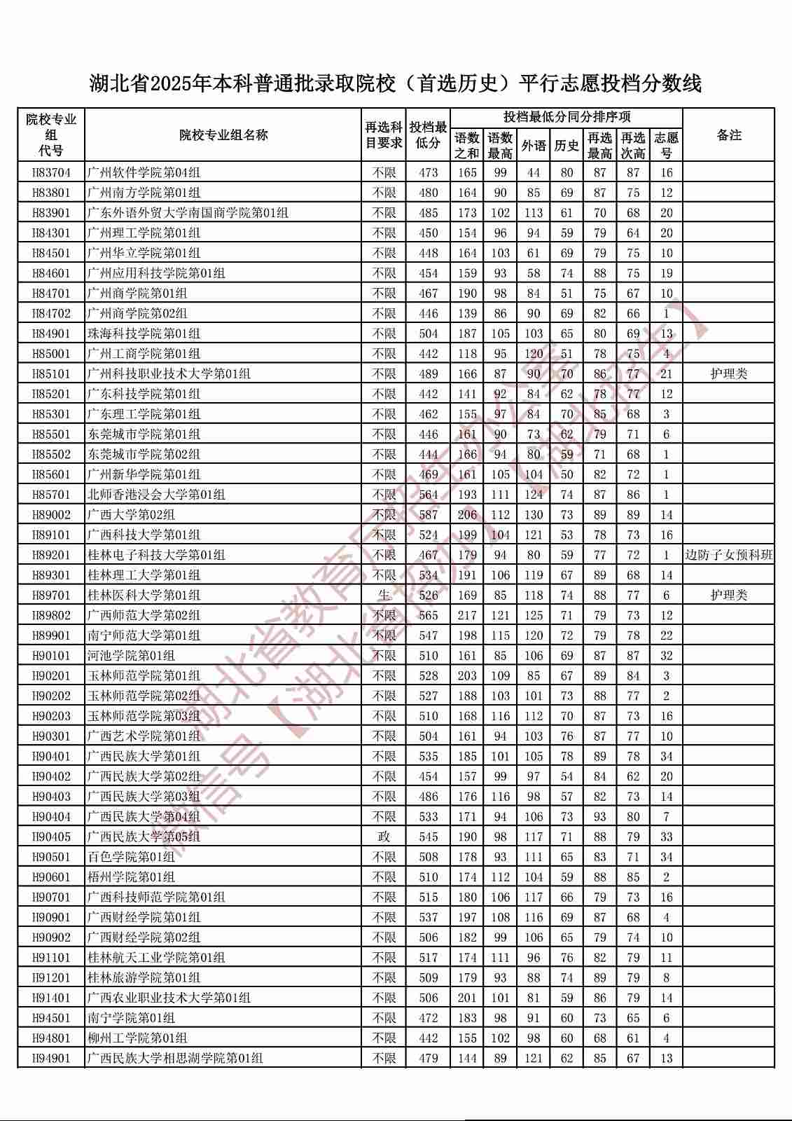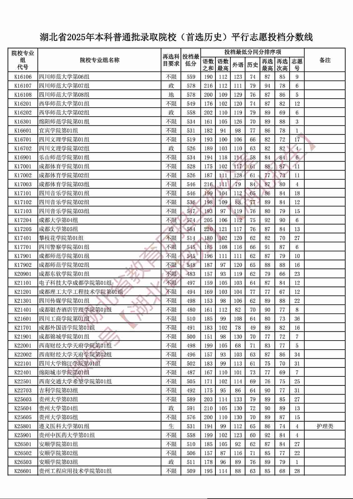 湖北省2025年本科普通批录取院校(首选历史)平行志愿投档分数线