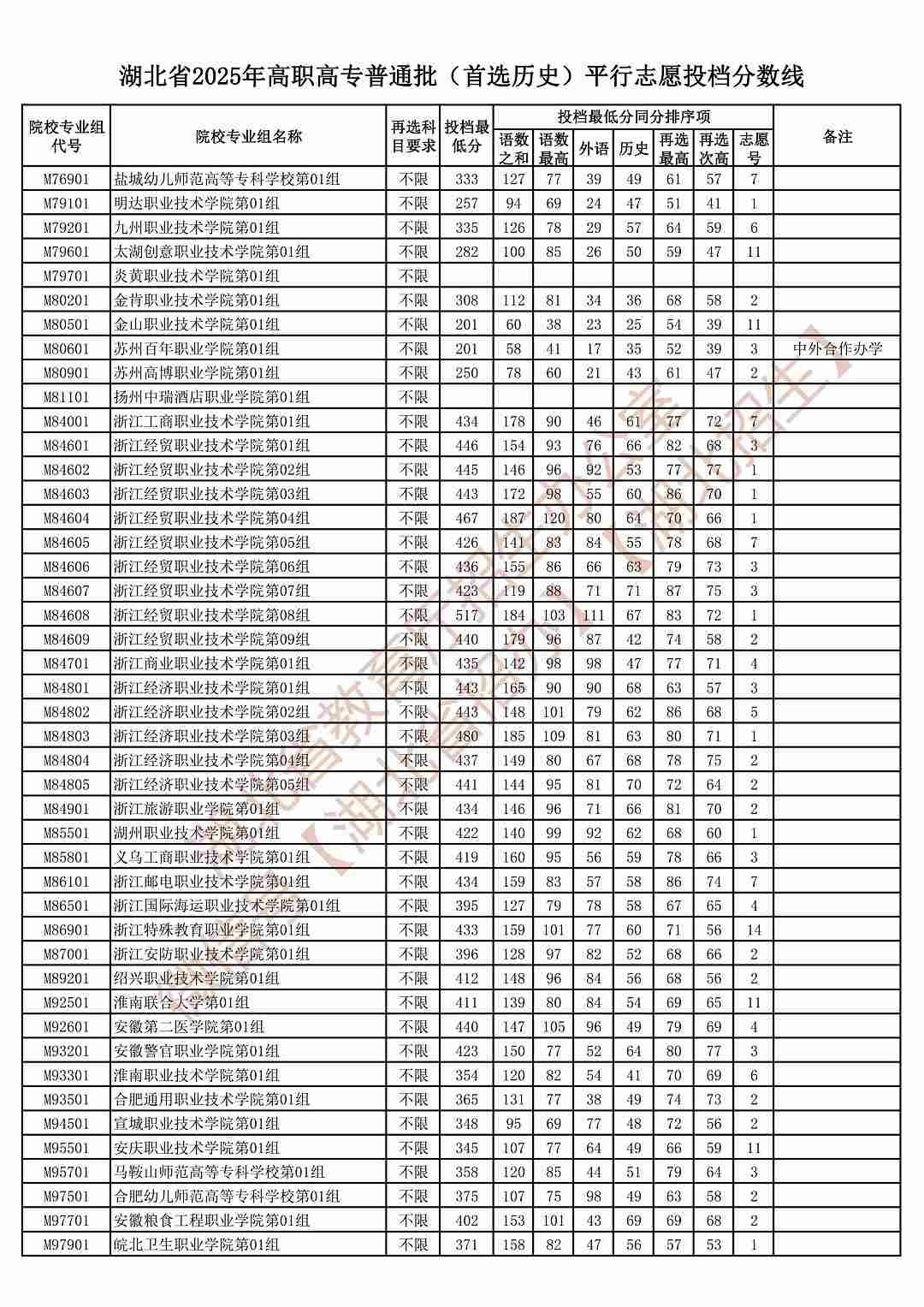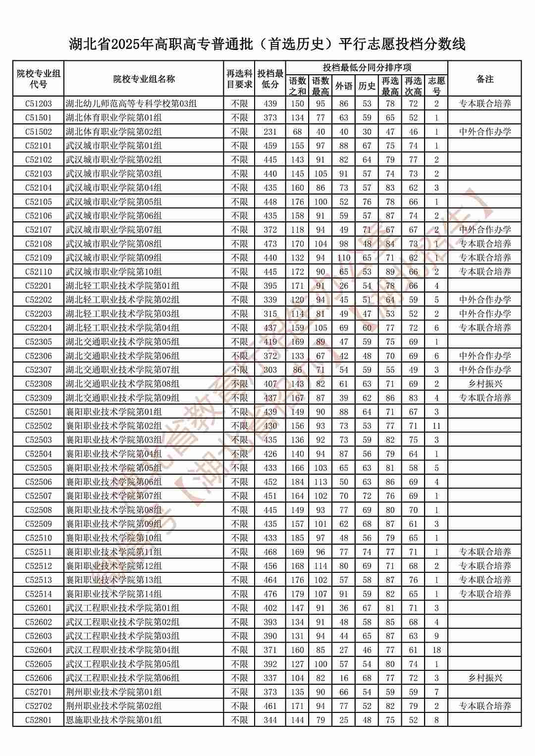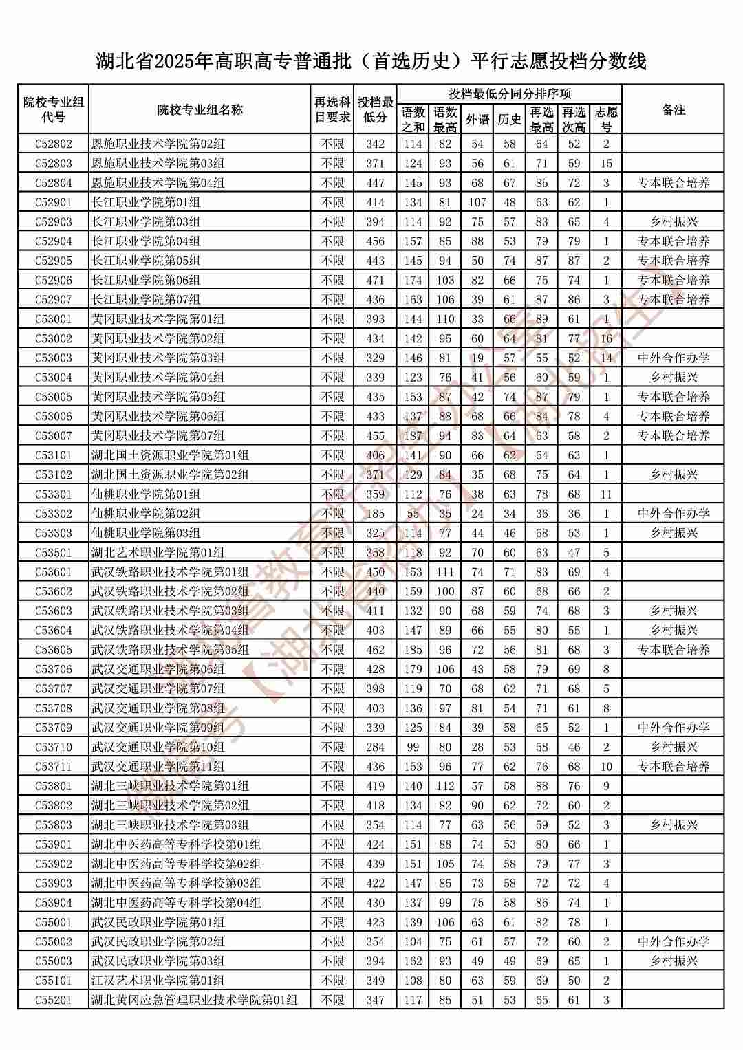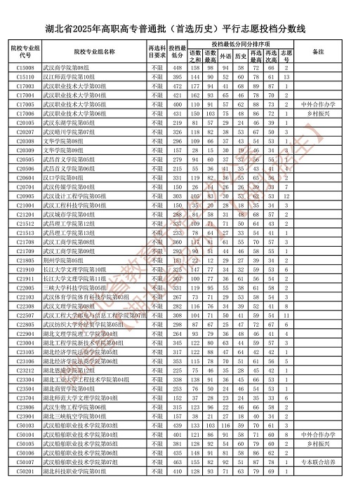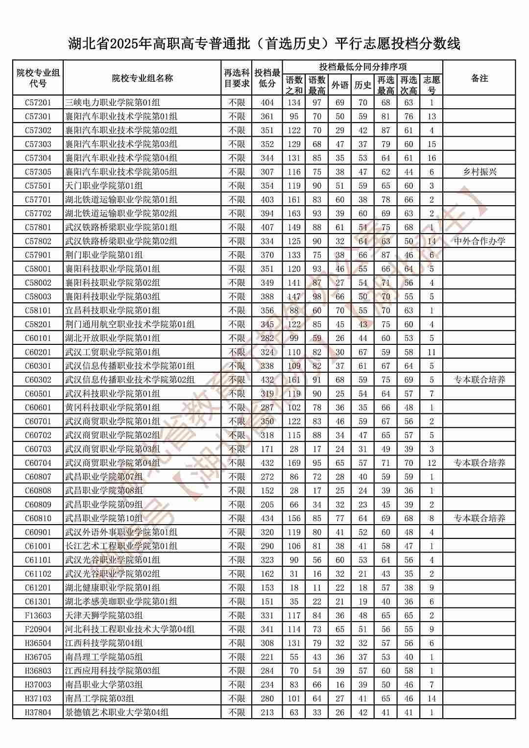湖北省2025年高职高专普通批(首选历史)平行志愿投档线发布