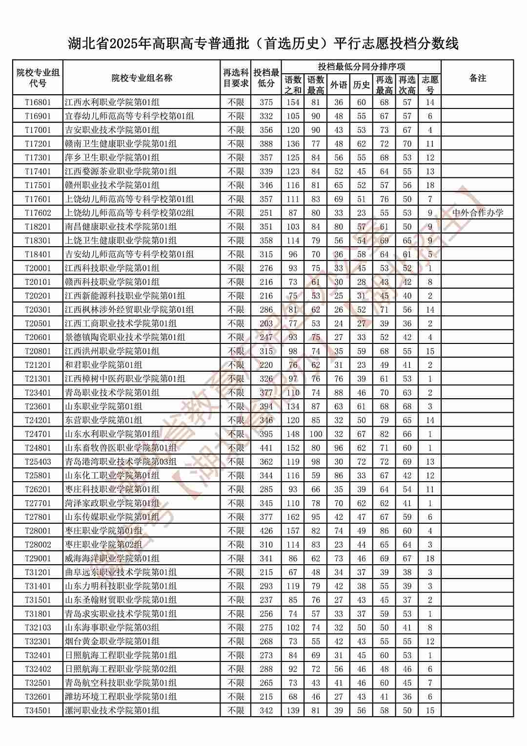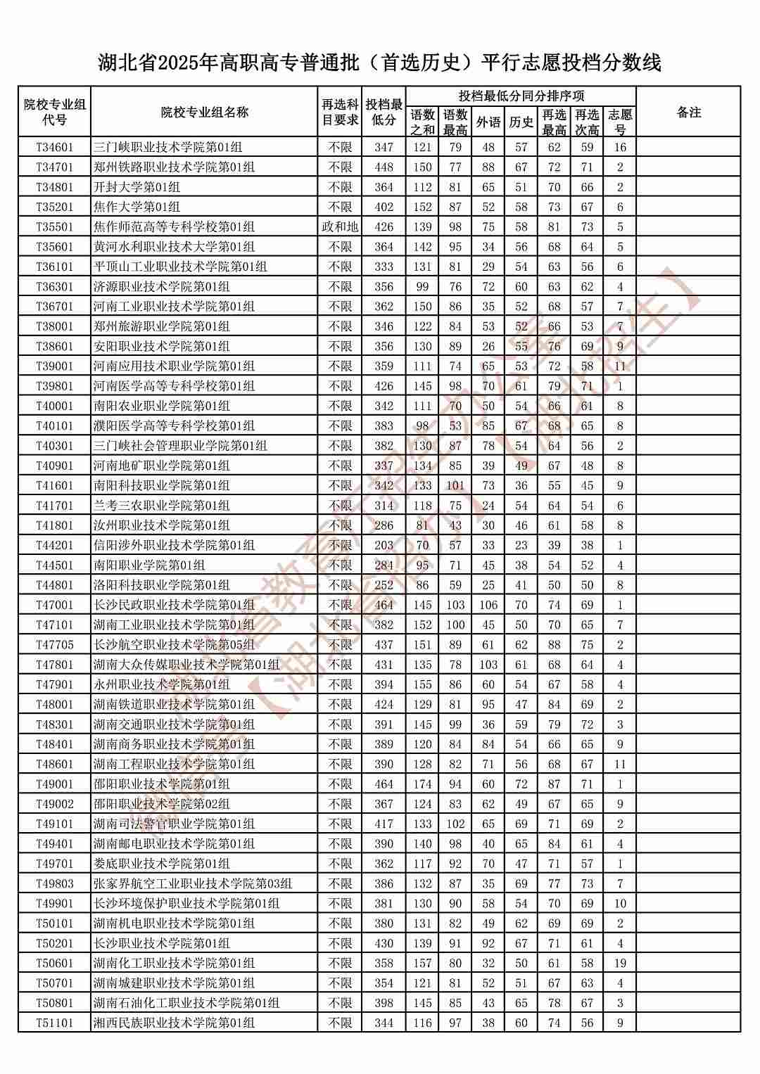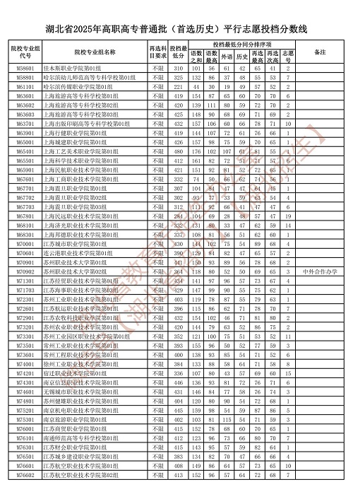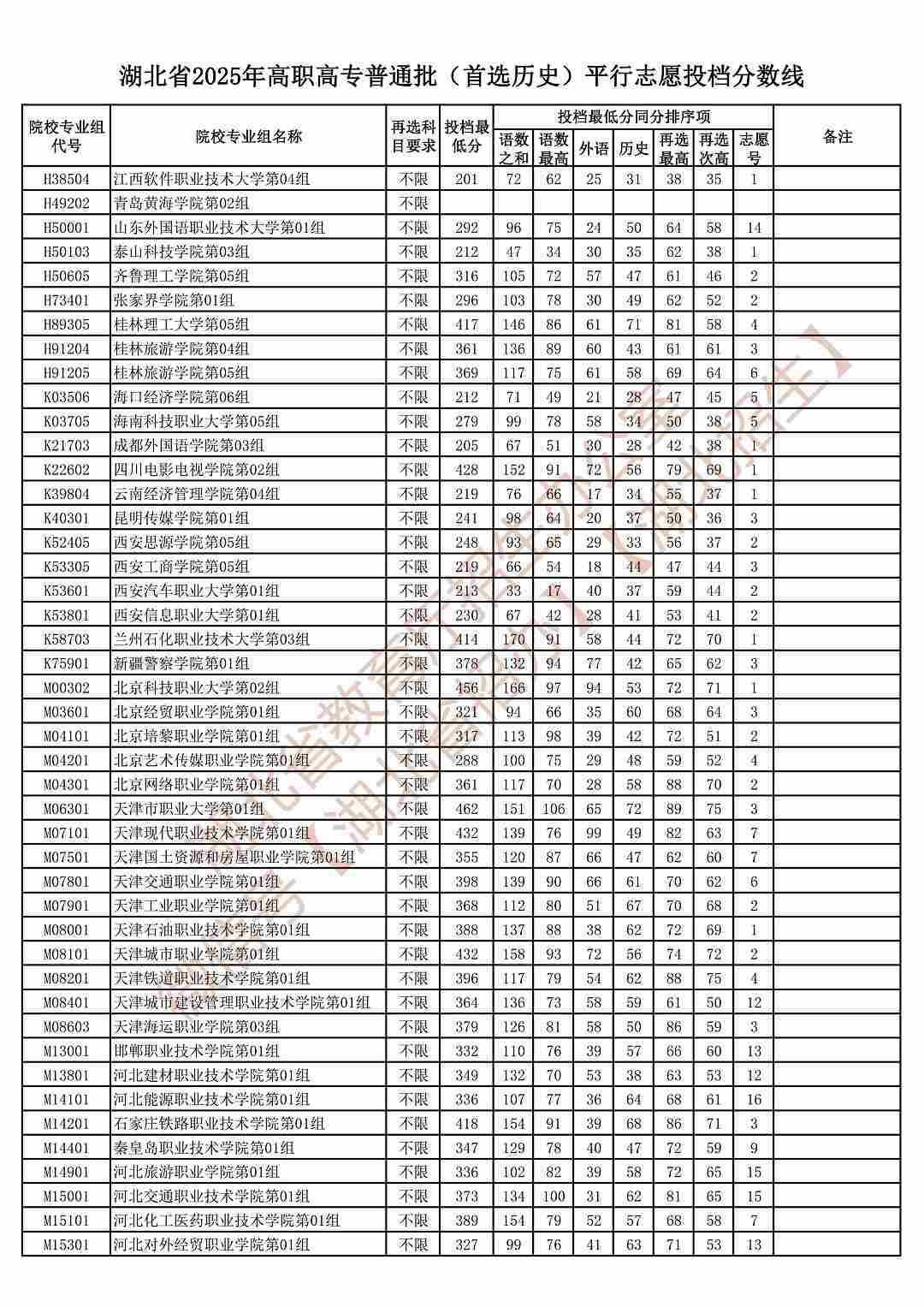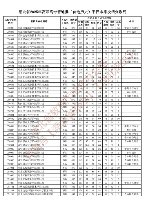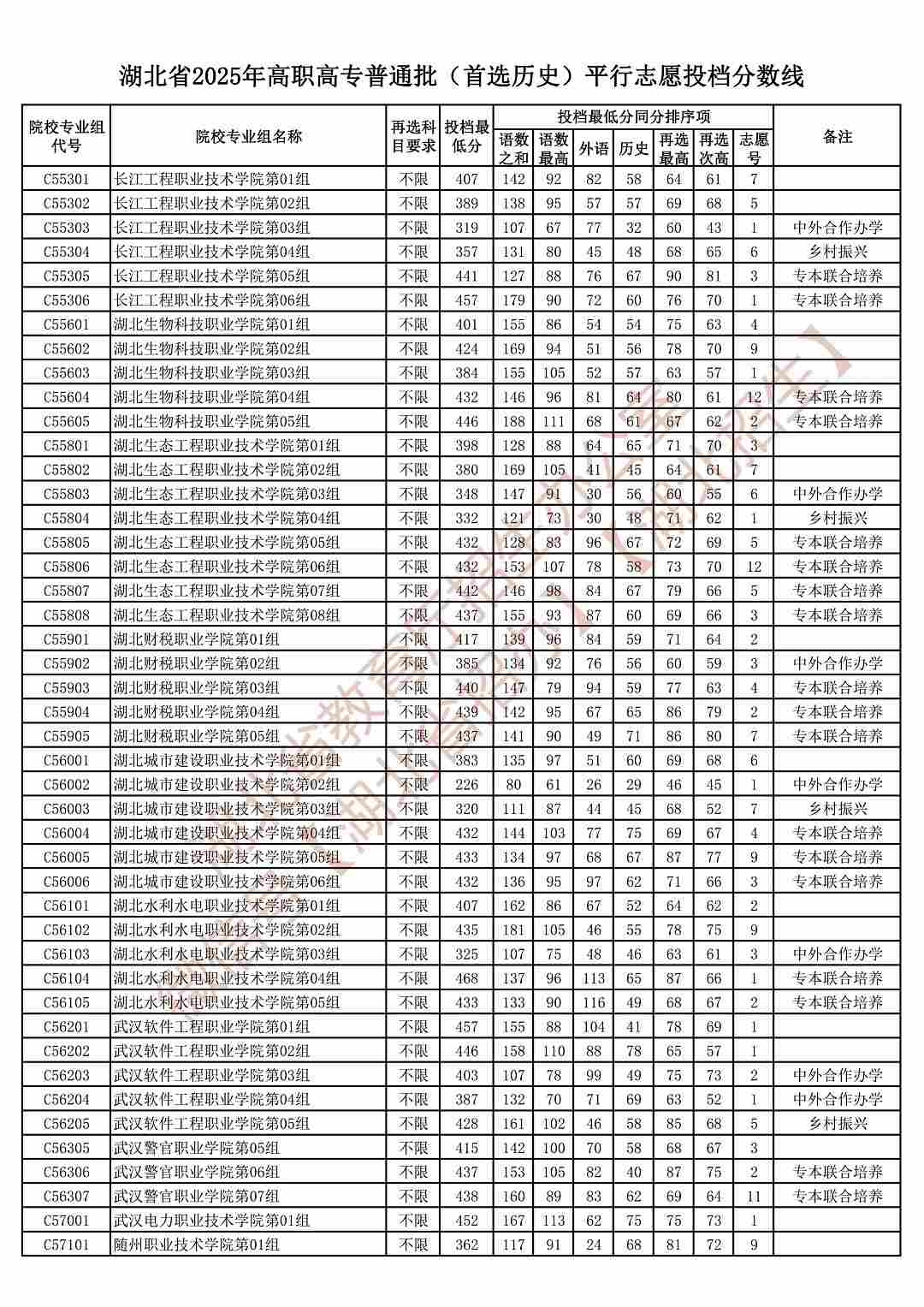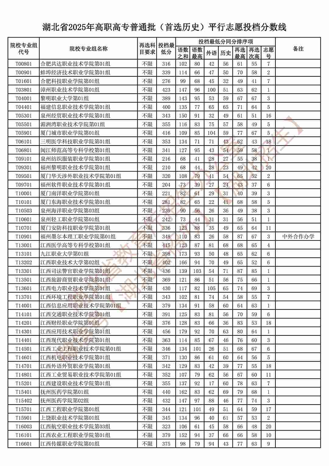 湖北省2025年高职高专普通批(首选历史)平行志愿投档线发布