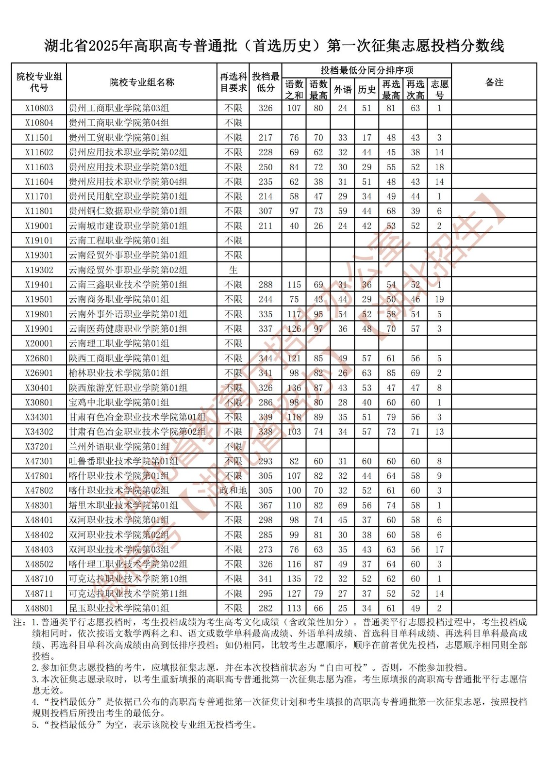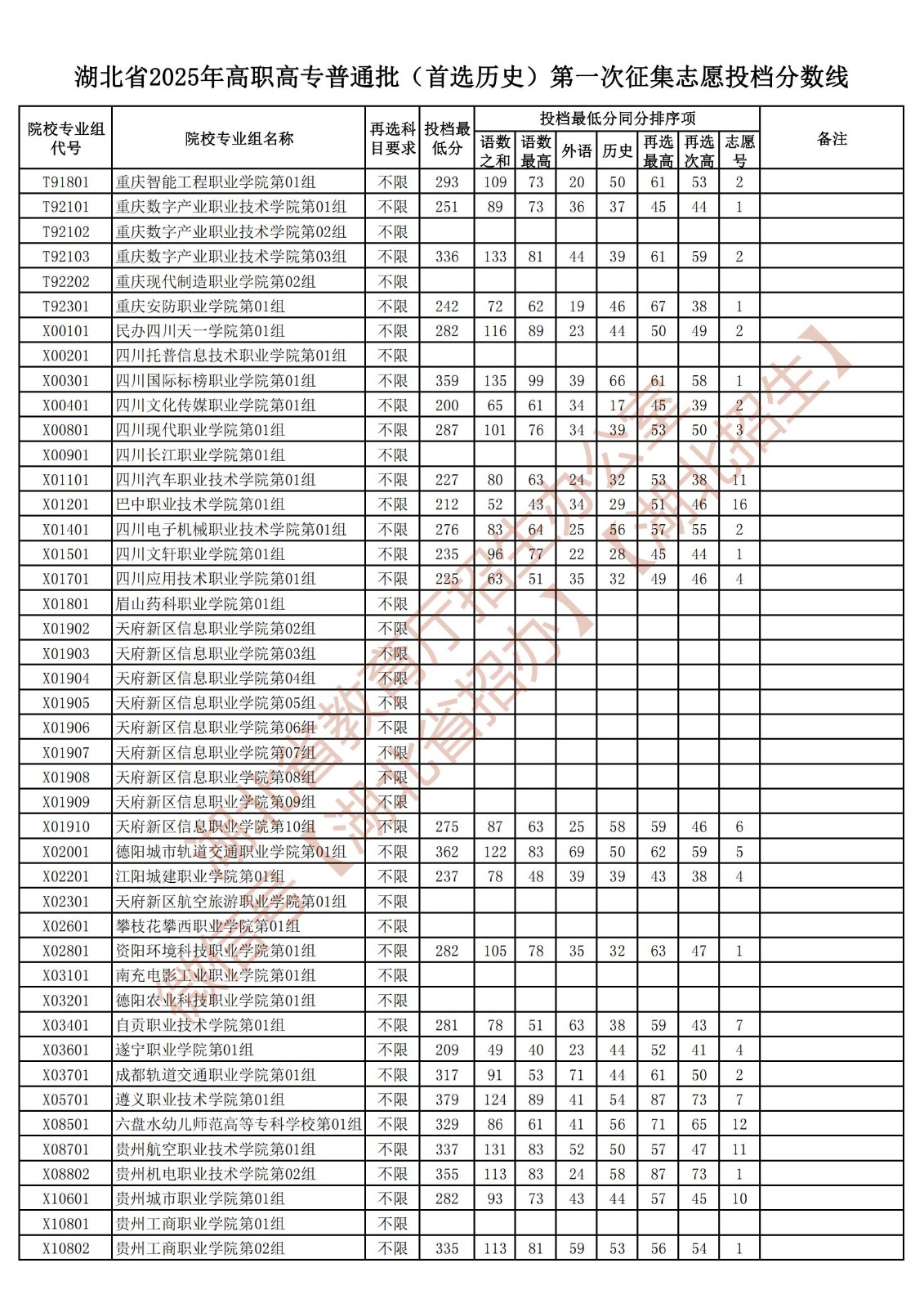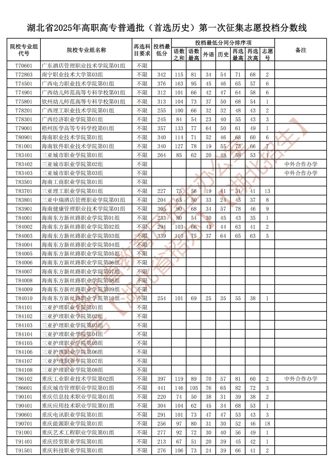 湖北省2025年高职高专普通批(首选历史)第一次征集志愿投档分数线